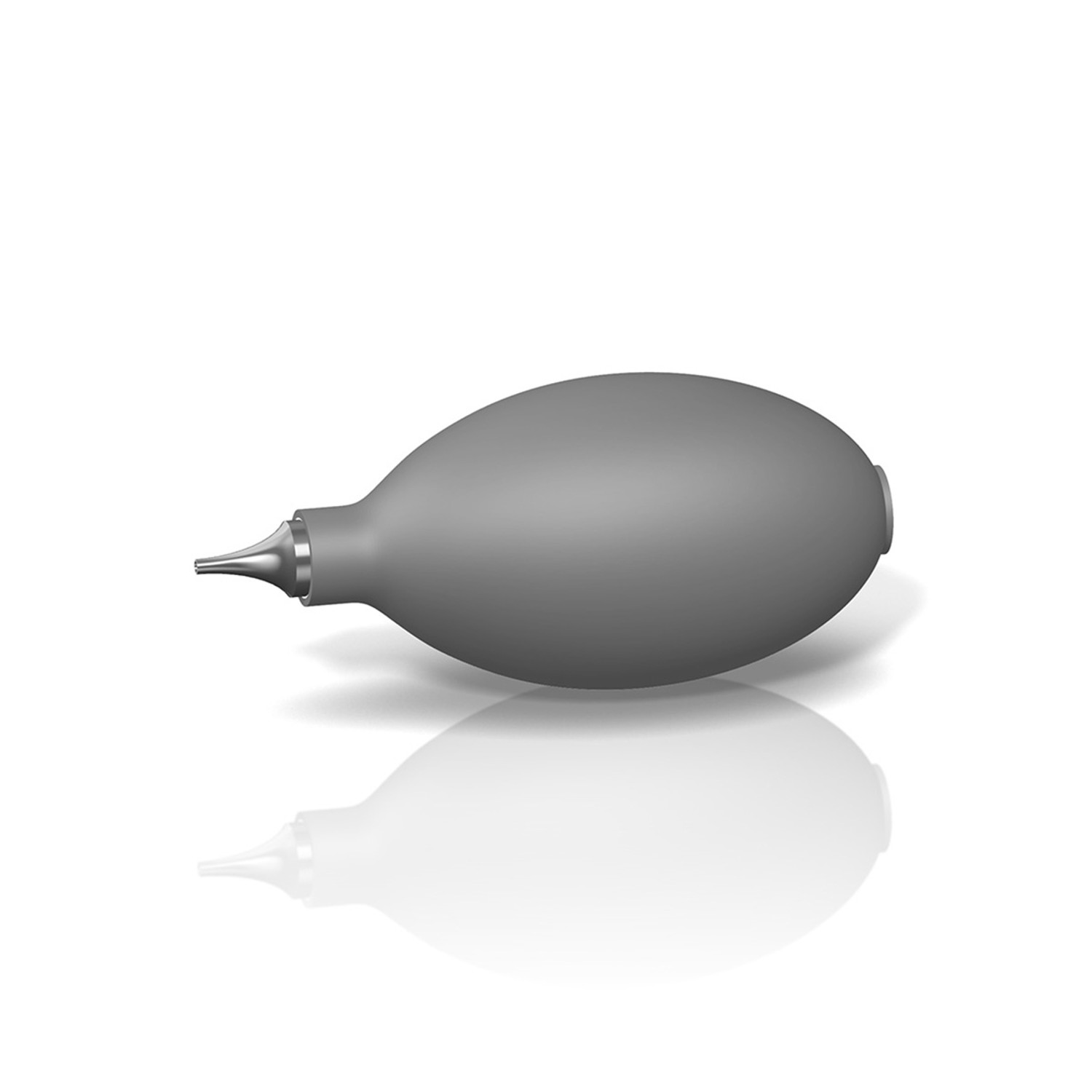 Ergonomically shaped bellows with chromed metal tip for blowing through sound tubing.