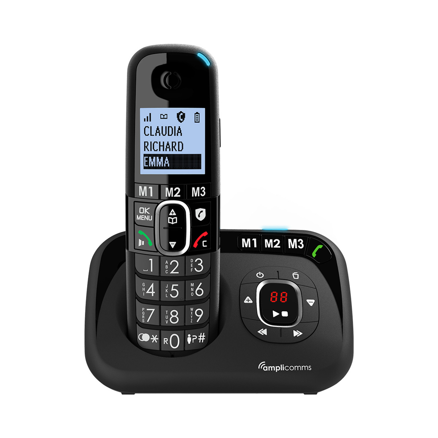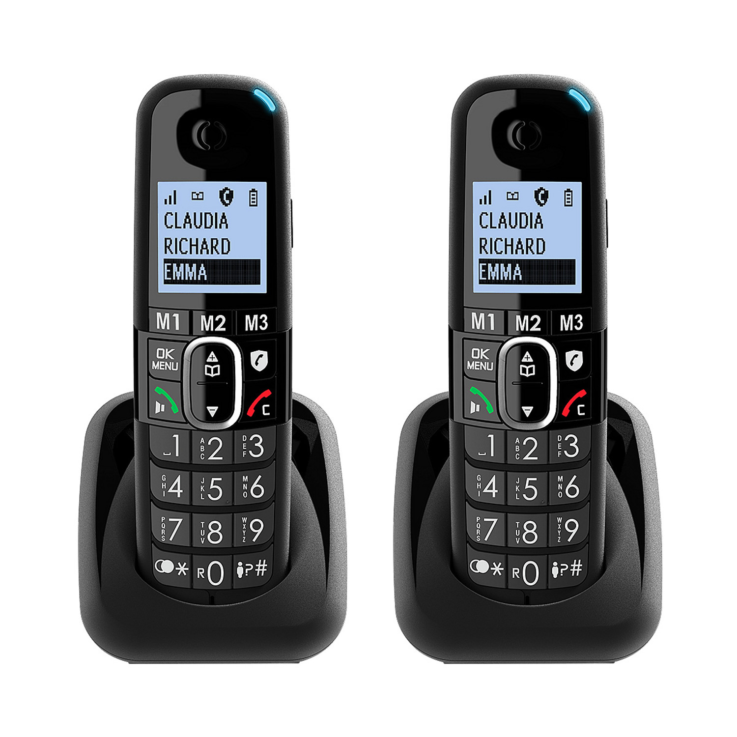 Ensemble de trois téléphones sans fil DECT pour les personnes malentendantes. Le volume de la sonnerie est réglable jusqu'à +90 dB, l'amplification de la parole jusqu'à +35 dB. En utilisant la fonction de blocage d'appel, les appels indésirables peuvent être bloqués. De plus, le Bigtel 1583 dispose de trois touches de mémoire et d'une fonction mains-libres. Jusqu'à 100 noms et numéros peuvent être stockés dans le répertoire. Le Bigtel 1583 est également équipé d'un répondeur facile à utiliser.