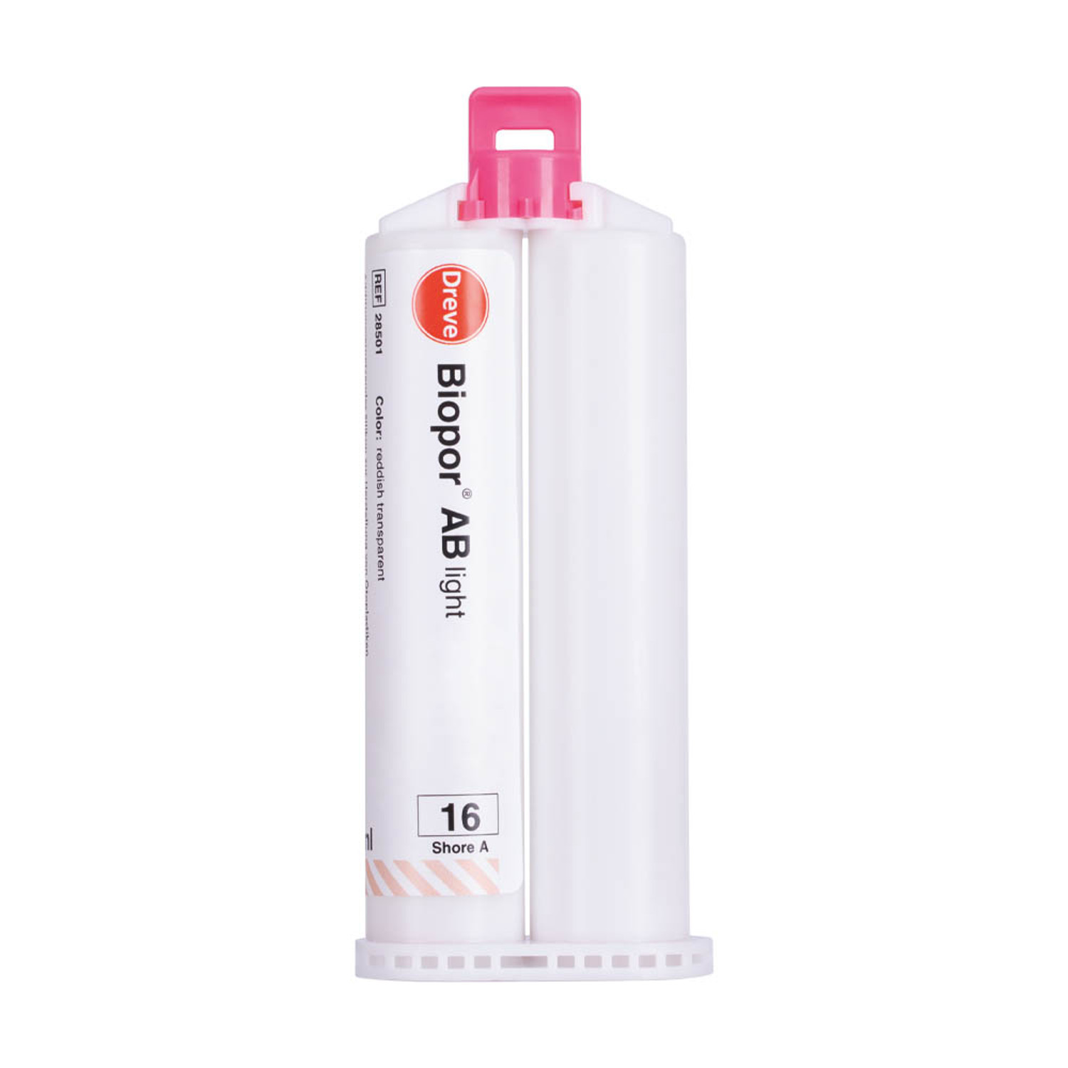 Biopor AB light 16 shore A est un matériau silicone de vulcanisation par addition pour des bouchons d'oreilles de haute qualité et durables, résistant aux éclaboussures. Les embouts légers Biopor AB light restent à la surface même lorsqu'ils sont laqués. Pour une surface brillante et facile à nettoyer, utilisez des vernis silicone. La fabrication indirecte se fait au laboratoire après la prise d'empreinte ou numérisation. Biopor AB est proposé en cartouche double S 50 avec connexion ronde.