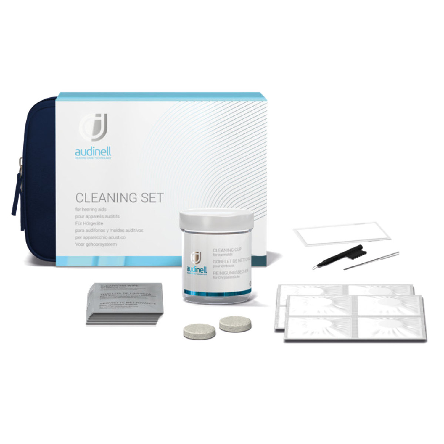 Kit de démarrage audinell pour un nettoyage des aides auditives, des protections auditives et des embouts auriculaires.