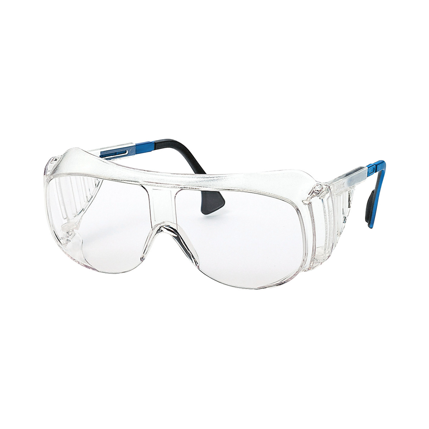 Lunettes de protection avec une monture robuste et légère en nylon et des côtés ajustables en longueur garantissant un bon ajustement, permettant de les porter par-dessus des lunettes normales.