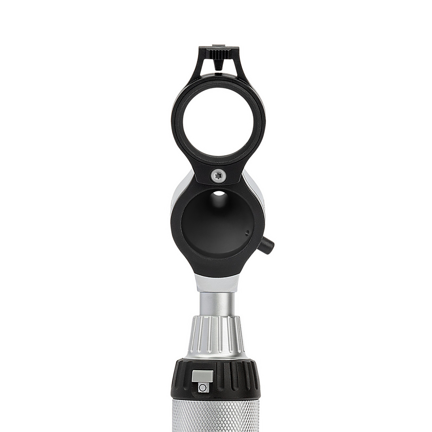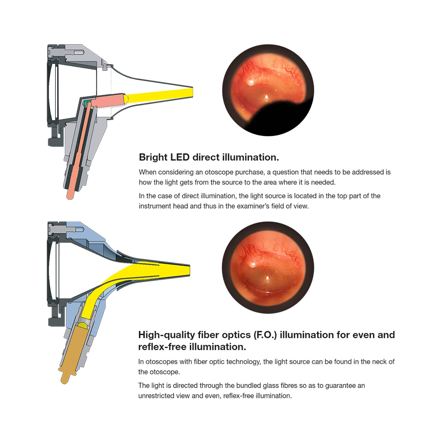 - Éclairage à fibre optique (F.O.) : Aucune obstruction de la source lumineuse dans le champ de vision grâce au positionnement de l’ampoule dans le col de l’otoscope. Cela garantit une image homogène et sans reflets.