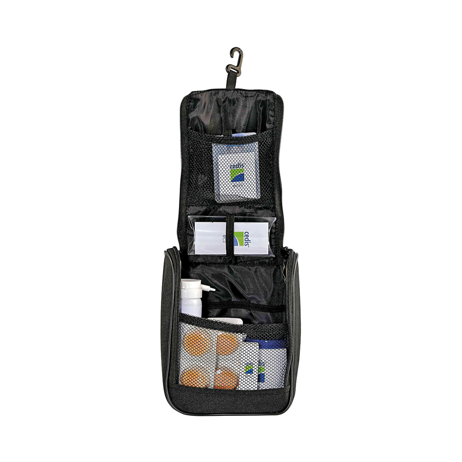 Le sac est équipé de deux fermetures à glissière. Une fois ouvert, il peut être suspendu à un crochet, ce qui facilite l'accès à vos produits de soins.
