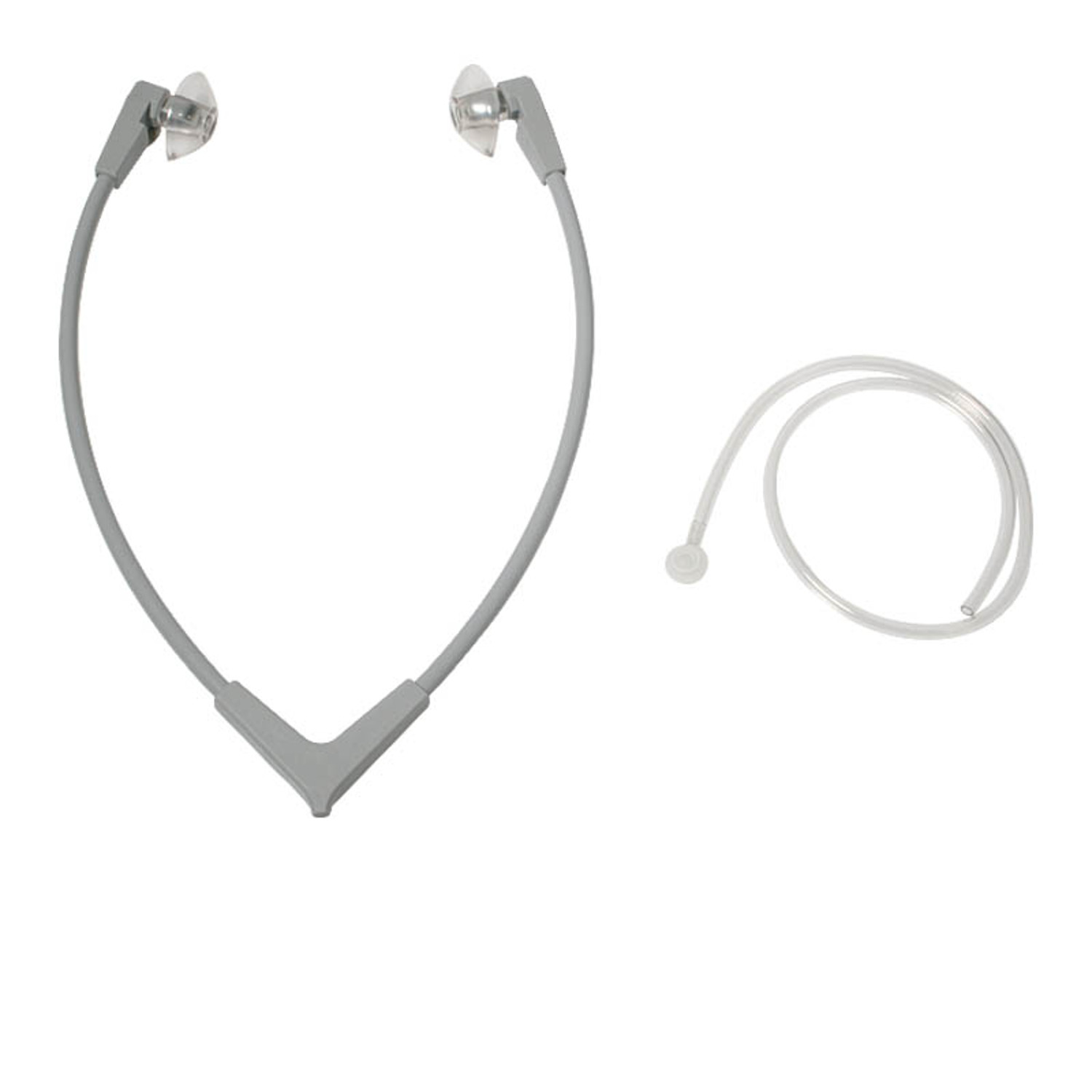 Stéthoscope gris avec embouts auriculaires en plastique dur.