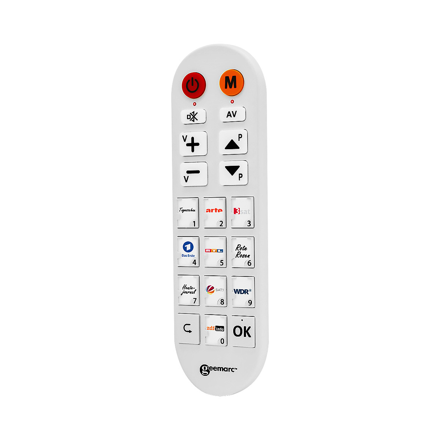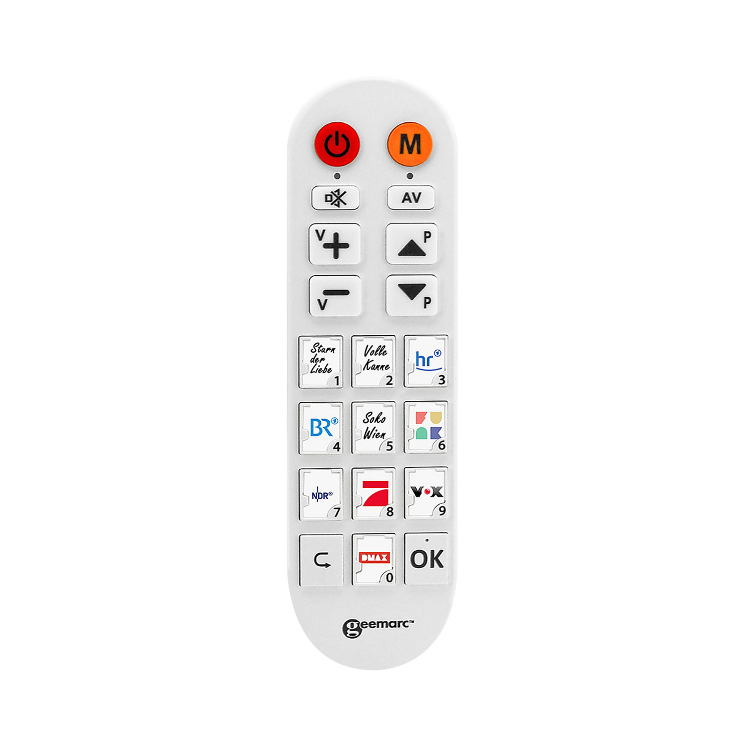 La télécommande Geemarc TV foto 100 pour seniors offre une solution conviviale pour utiliser la télévision, entre autres. Le passage d'une chaîne à l'autre et le réglage du volume sont facilités par de grands boutons clairs. Ces boutons peuvent être étiquetés avec des images, comme les logos des chaînes TV préférées, pour créer une sensation de familiarité et de confort lors du visionnage de la télévision.