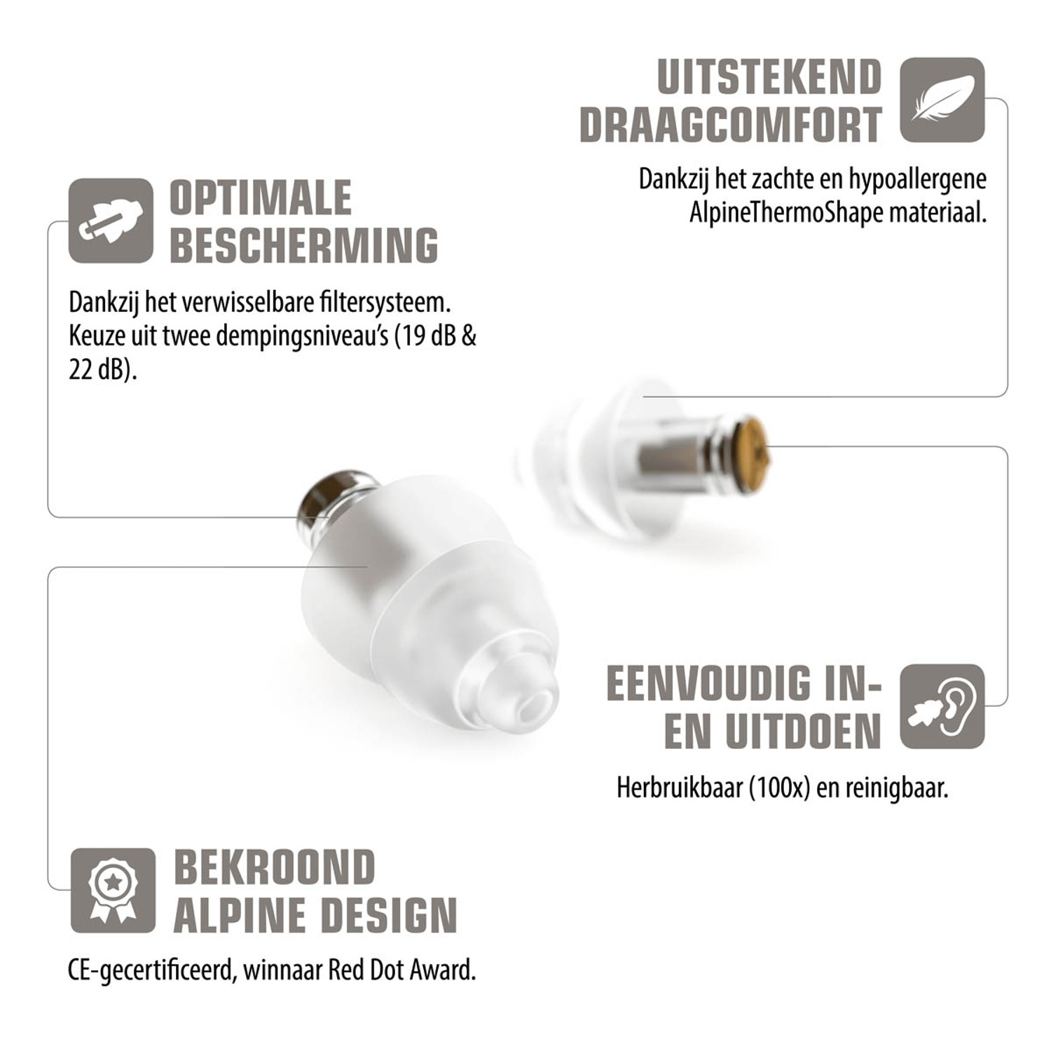 - Dempt schadelijk geluid en voorkomt lawaaidoofheid