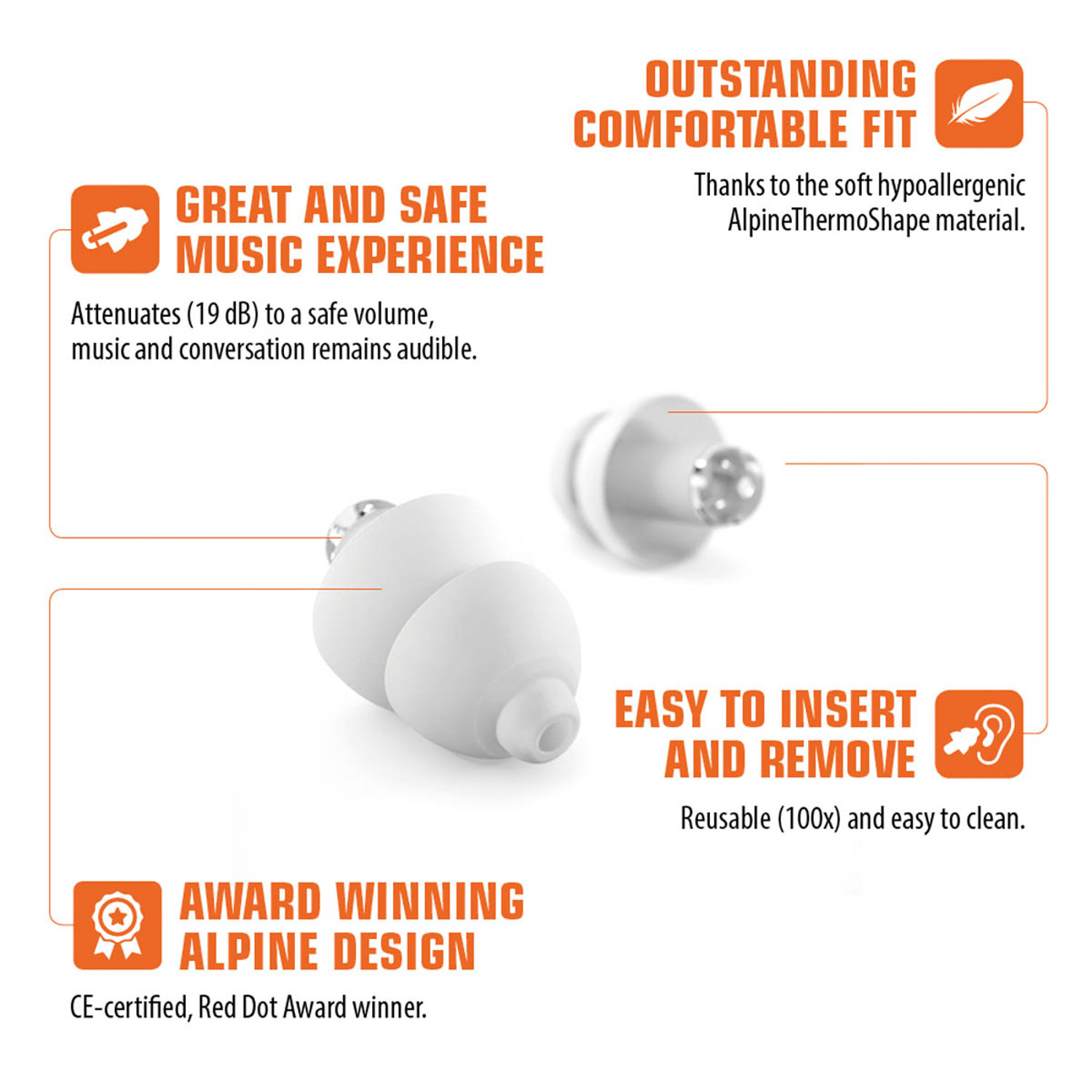 De Alpine PartyPlug is de ideale keuze voor professionals die hun klanten betrouwbare bescherming en hoog draagcomfort willen aanbieden, zonder verlies van muziekbeleving.