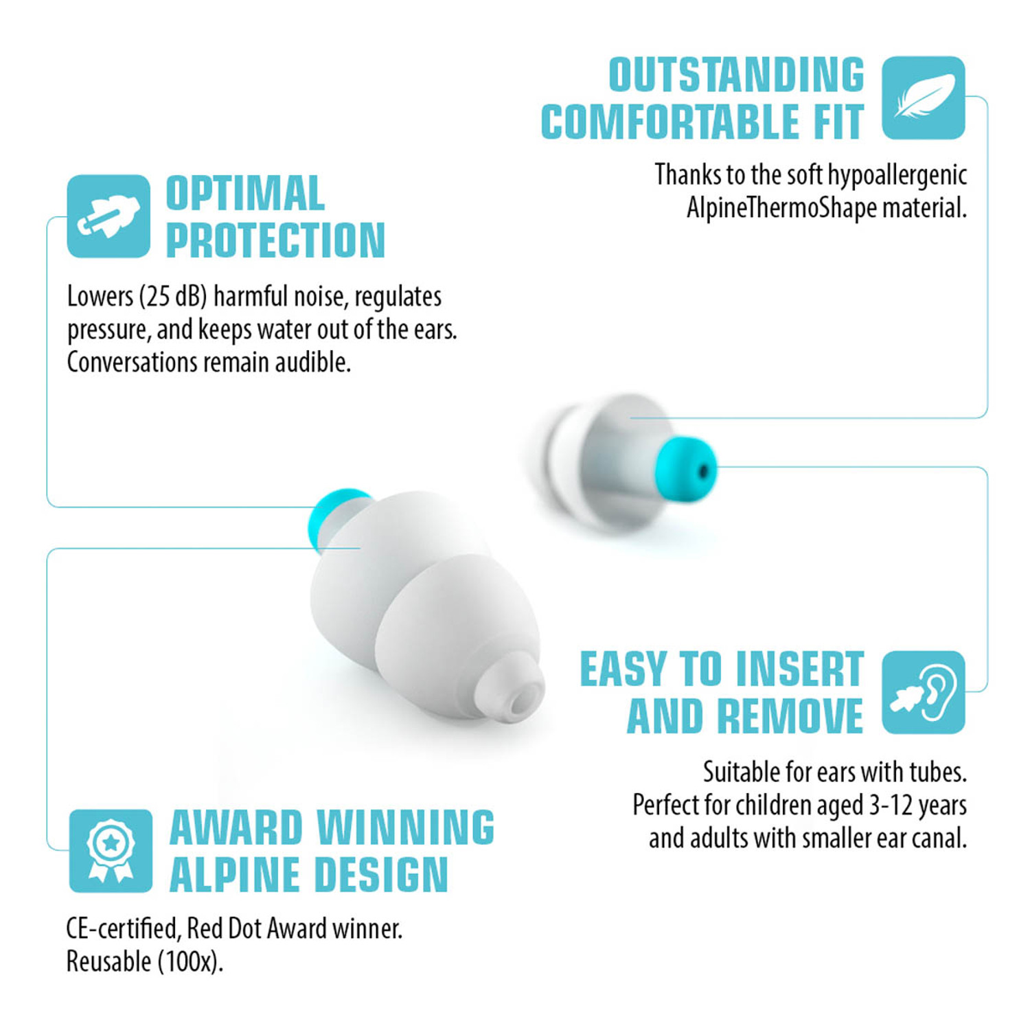 Pluggies kids zijn speciaal ontwikkeld om kwetsbare kinderoren te beschermen tegen harde geluiden en muziek. Daarnaast kunnen de oordoppen ook worden gebruikt om rustig te kunnen slapen of om de oren tijdens het zwemmen of douchen te beschermen tegen water. Pluggies kids zijn geschikt voor kinderen tussen 4 en 12 jaar oud.