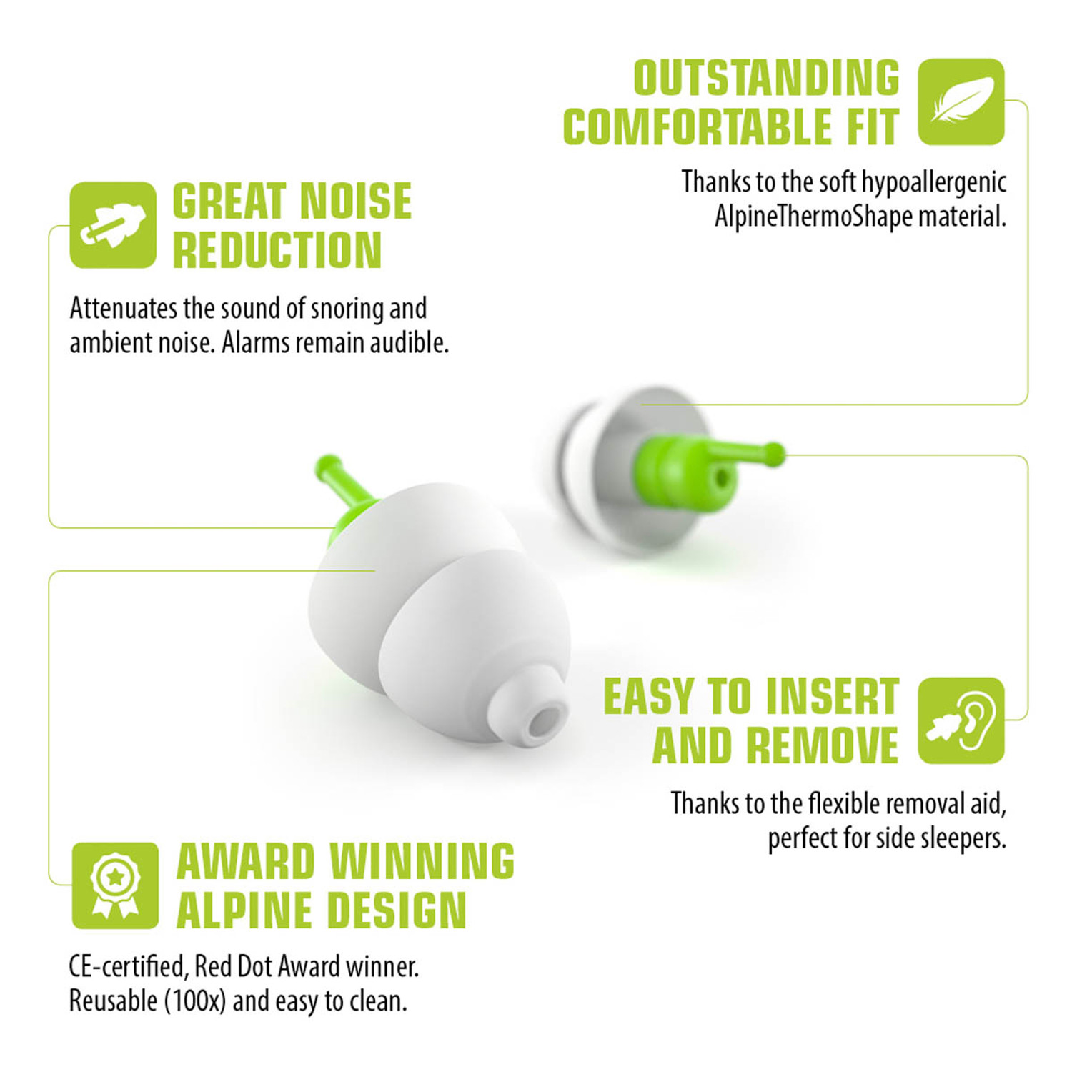 De Sleepsoft oordoppen van Alpine hebben een demping van 25 dB. Hierdoor zijn harde geluiden nog steeds hoorbaar, maar klinkt het vele malen zachter.