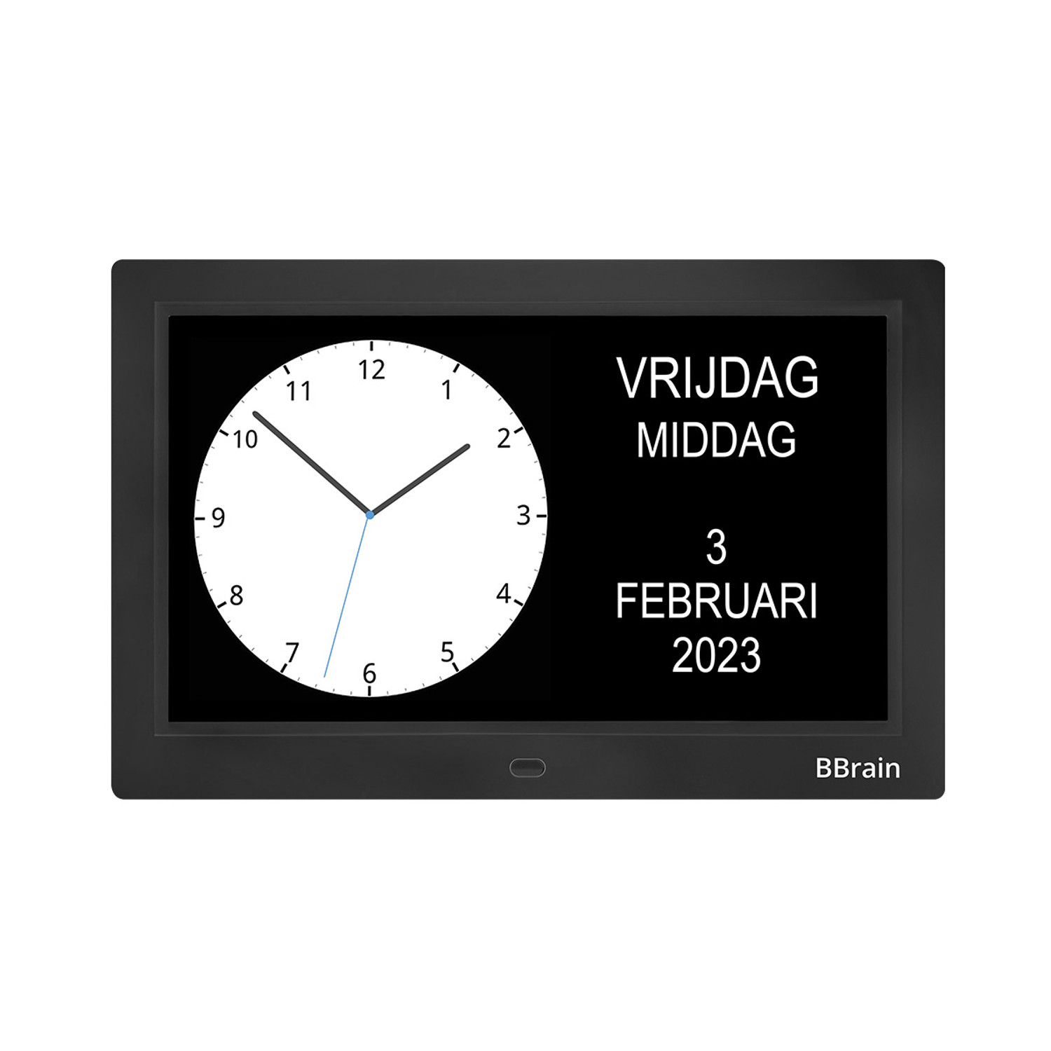bbrain basic analoge dementieklok is een gebruiksvriendelijke kalenderklok met een helder 10 inch display die tijd, datum, dag en dagdeel duidelijk weergeeft. Dankzij de hoge contrastinstellingen en de slechtziende modus is deze klok ook geschikt voor gebruikers met verminderd zicht. De analoge wijzerplaat en de overzichtelijke tekstweergave bieden houvast en structuur, wat de klok ideaal maakt voor mensen met (beginnende) dementie of geheugenproblemen.