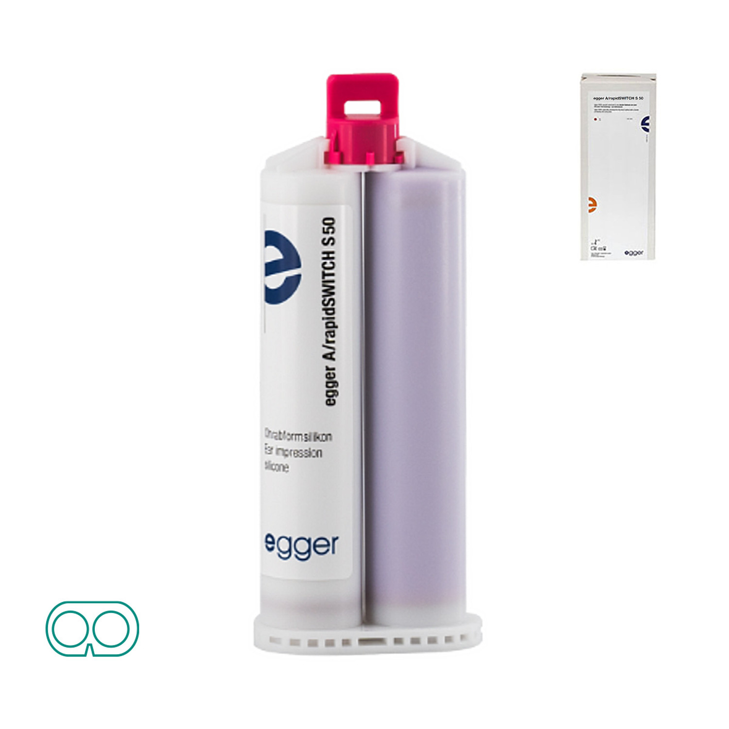 egger A/rapidSWITCH S 50 is ideaal voor situaties waarin snelheid, precisie en controle essentieel zijn, zoals in de dagelijkse workflow van de audicien. Het afdrukmateriaal wordt met een Automix-systeem direct en luchtbelvrij in de gehoorgang aangebracht, waarbij de kleurverandering een duidelijk signaal geeft dat het materiaal uithardt.