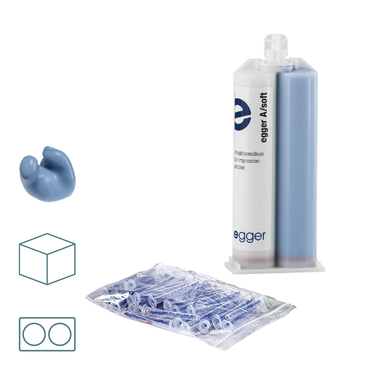 Het A/soft siliconen afdrukmateriaal in de dubbele standaard cartridge biedt een uitstekende doorstroming en een hoge mate van vormvastheid. Het materiaal is niet kleverig of glad en zorgt voor een lichte drukopbouw, wat bijdraagt aan een nauwkeurige afdruk die comfortabel is voor de klant. De eindhardheid is 35 shore. Het A/soft afdrukmateriaal is geschikt voor een grote doelgroep en kan ook worden gebruik voor de vervaardiging van gehoorbescherming.