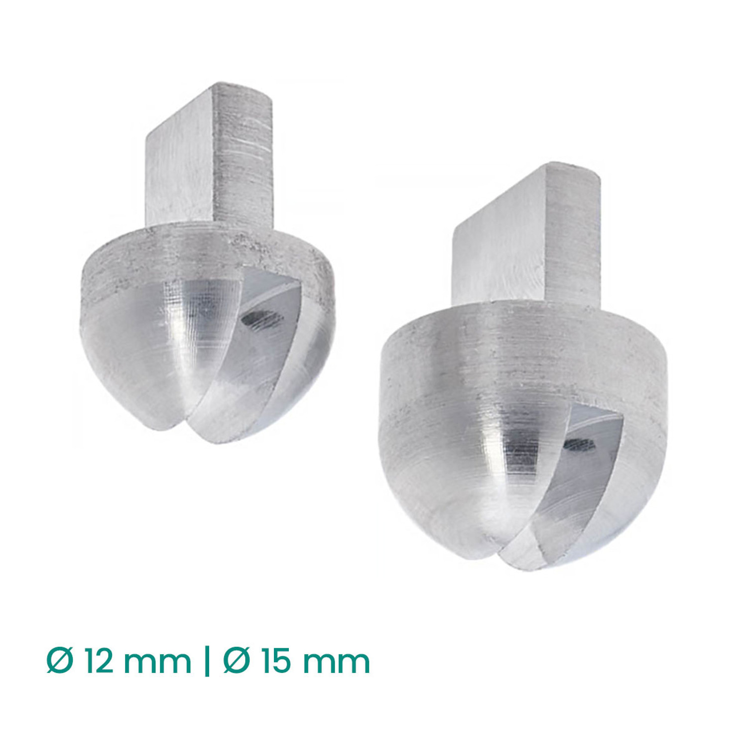 Greepmallen voor de productie van greep holtes in siliconen oorstukjes. De set bestaat uit een kleine (Ø 12 mm) en een grote mal (Ø 15 mm).