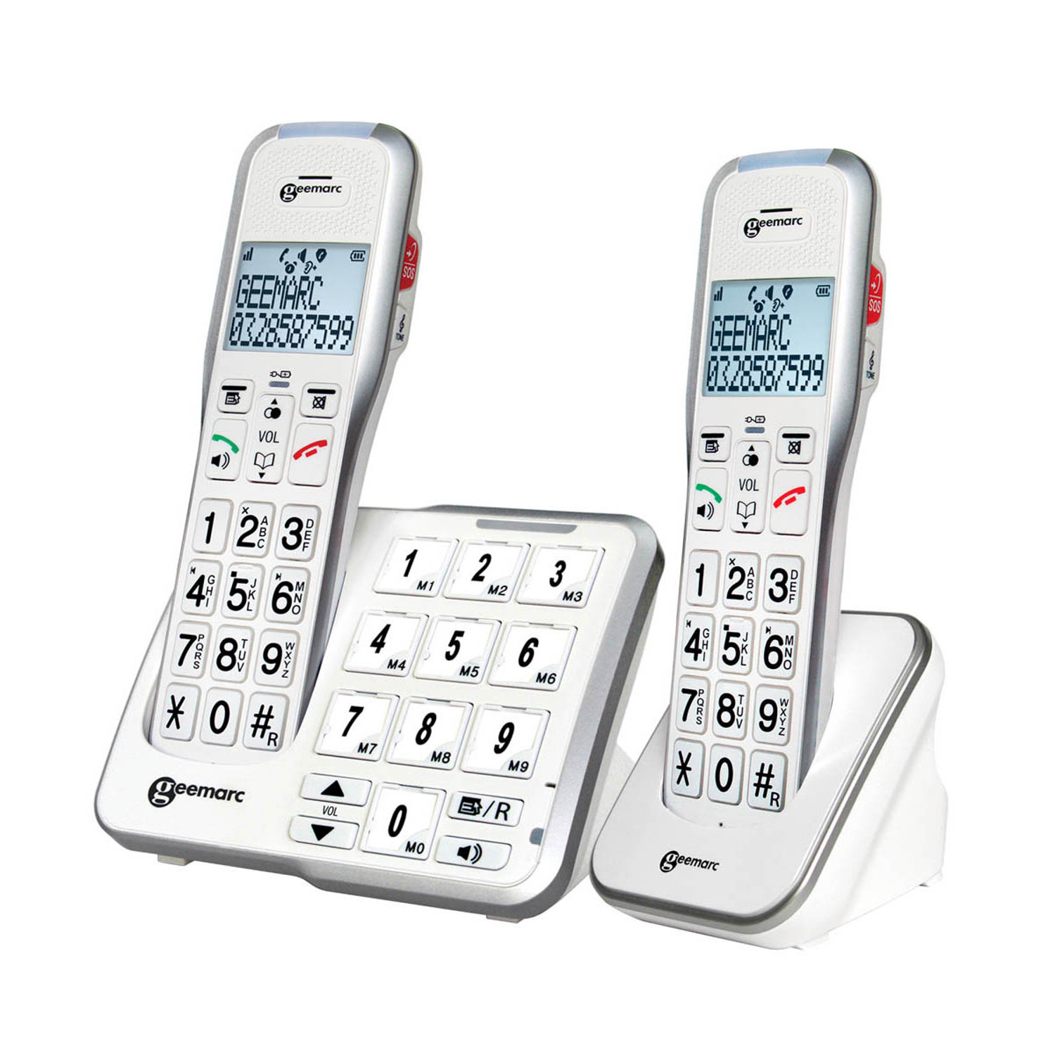 De Geemarc AmpliDECT 595 Photo Duo is een draadloze DECT-telefoonset bestaande uit een basisstation met 10 fototoetsen en een extra handset. Deze telefoon is speciaal ontworpen voor gebruikers die behoefte hebben aan extra luid gespreksvolume (+50 dB) en een beltoonvolume tot +80 dB, waardoor gesprekken helder en duidelijk blijven, zelfs in rumoerige omgevingen. Dankzij de spraakfunctie worden ingetoetste cijfers en inkomende oproepen hoorbaar aangekondigd – ideaal voor slechthorenden en slechtzienden.