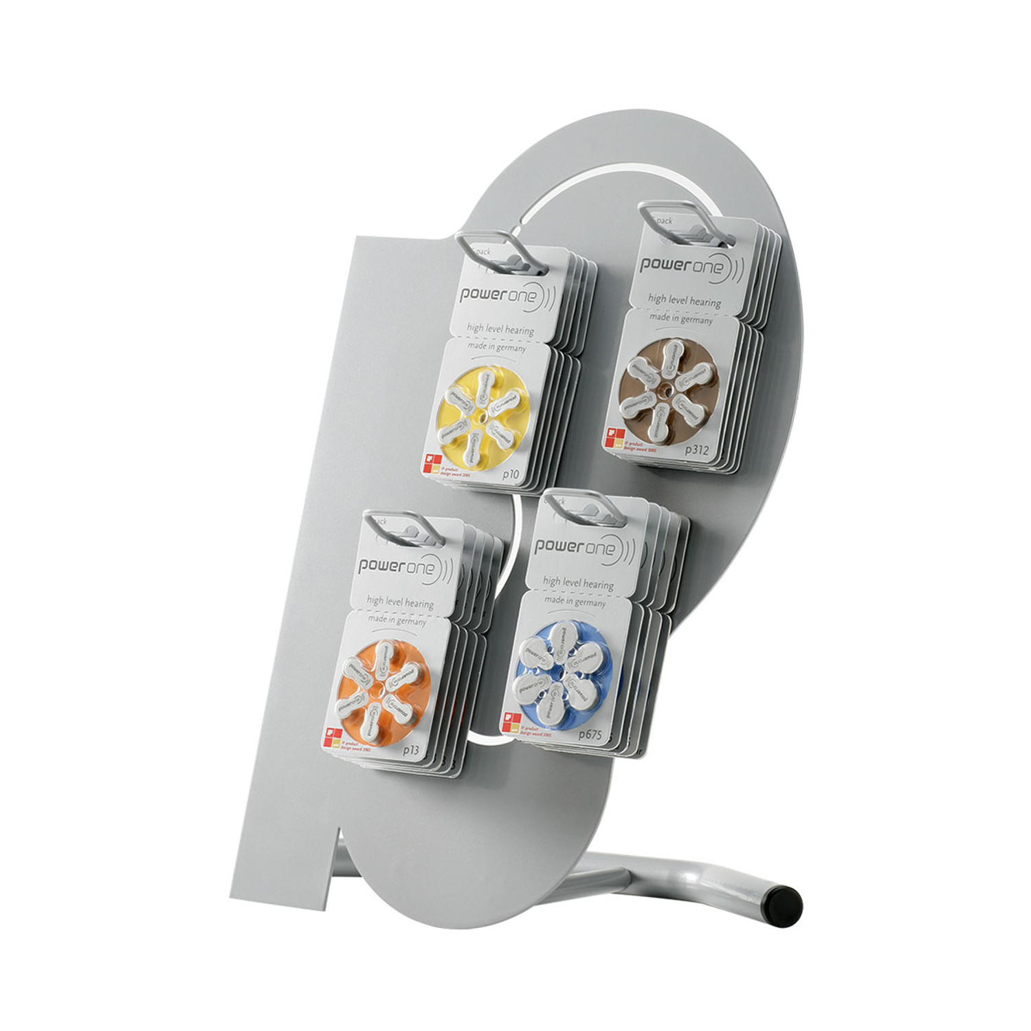 Metalen display met 4 haken in de vorm van een oor voor een mooie presentatie van hoortoestel batterijen.