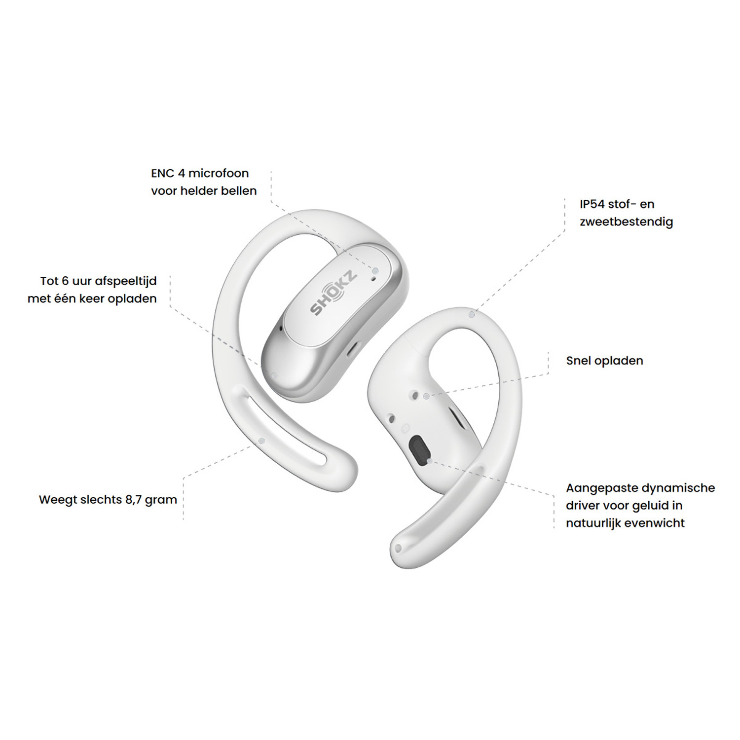 - Veilig en comfortabel dankzij flexibele siliconen oorhaken die stevig blijven zitten, ook bij intensief bewegen.